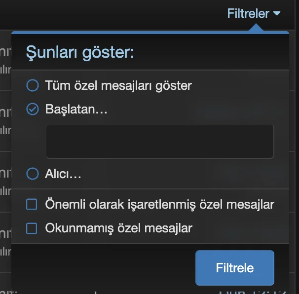 Özel mesaj listesini belirli kriterlere göre filtreleyebilirsiniz. Filtreler şu şekildedir;